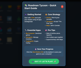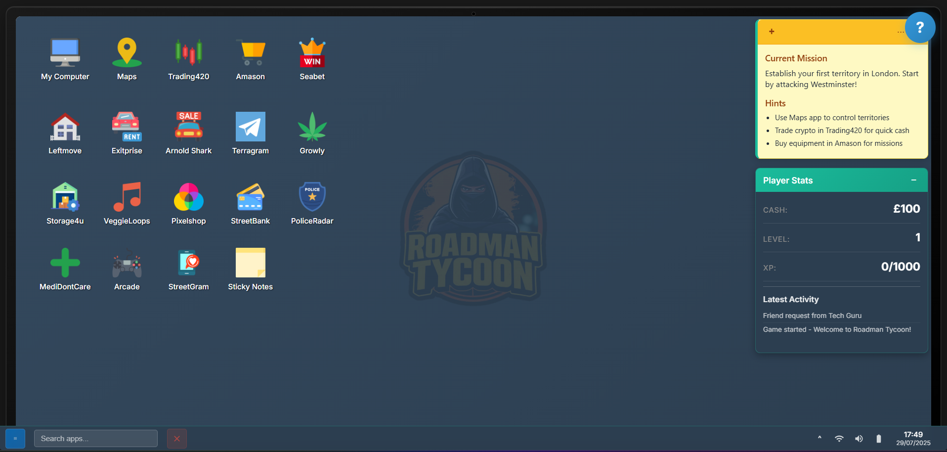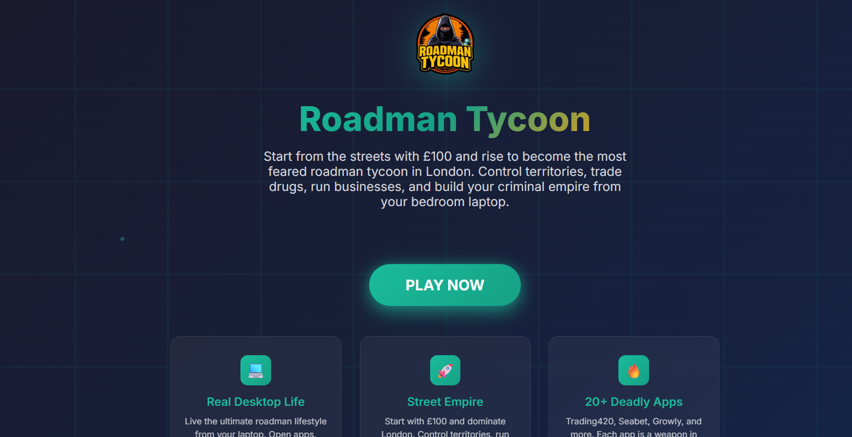 Start from the streets with £100 and rise to become the most feared roadman tycoon in London. Control territories, trade drugs, run businesses, and build your criminal empire from your bedroom laptop.